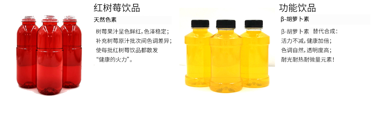 It can provide liquid and powder two forms, which can make solid beverage powder evenly colored; resistant to high temperature sterilization, soft and bright, stable color; non-staining bottle, no oil ring, stable color, long shelf life, bright color, high temperature resistance, good stability.