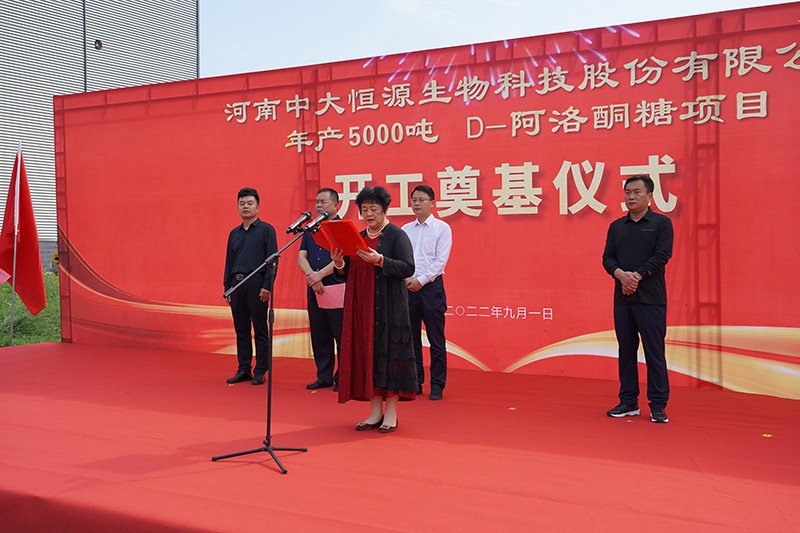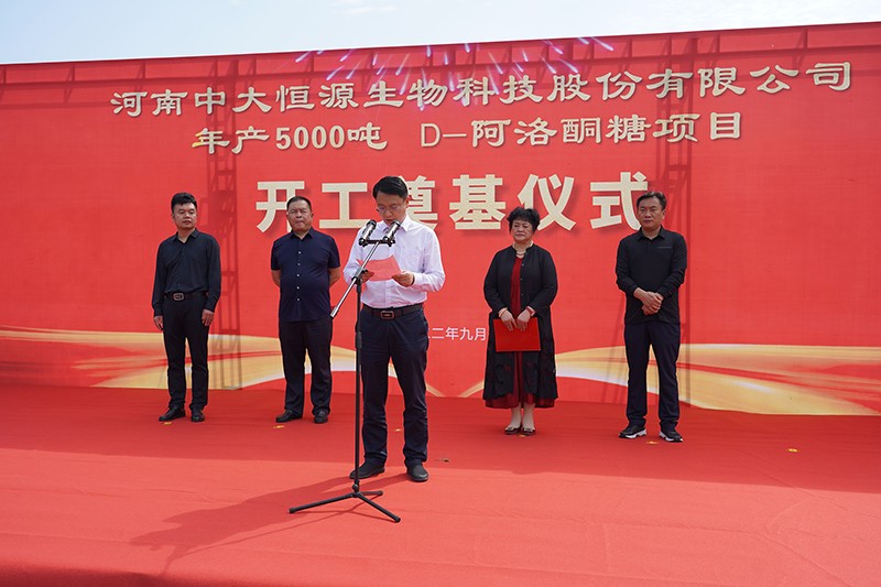 D-阿洛酮糖項目開工奠基儀式圓滿完成 作者:中大恒源 來源: 日期:2022-09-05 08:54:14 9月1日中大恒源公司舉行D-阿洛酮糖項目開工奠基儀式,項目總投資1.6個億,建設周期8個月。臨潁縣縣委副書記、縣長李俊偉、縣委常委李紅偉、經(jīng)開區(qū)管委會副主任邢培忠、中大恒源董事長文雁君出席儀式并培土奠基。中大恒源董事長文雁君介紹項目情況臨潁縣縣委副書記、縣長李俊偉致辭儀式最后眾領導共同為D-阿洛酮糖項目培土奠基 關鍵詞: